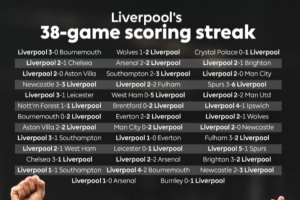 体育资讯9月16日讯 根据英超官方统计,利物浦连续38场联赛取得进球。