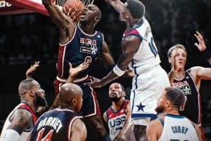梦一队阵容:乔丹、魔术师约翰逊、巴克利、卡尔-马龙、尤因、皮蓬、大卫-罗宾逊、克里斯-穆林、克莱德-德雷克斯勒、斯托克顿、克里斯蒂安-莱特纳。