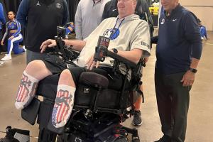 体育资讯11月06日讯 前NBA球员、53 岁的“大竹竿”肖恩·布拉德利今日坐轮椅观战独行侠,并与他的独行侠前队友波派·琼斯聊天。
